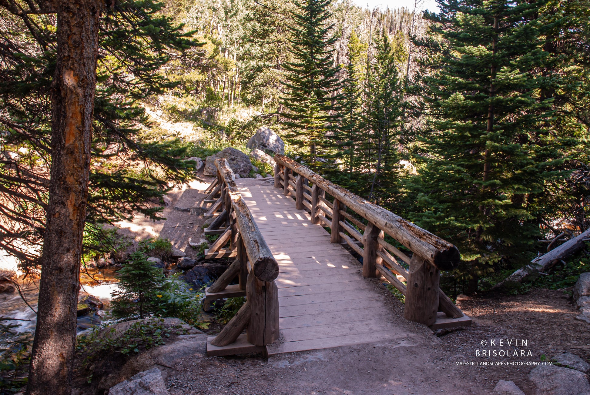 1 of a few small foot bridges crosses above a creek heading to Mills Lake in glacier gorge, Rocky Mountain National Park. (593-486)