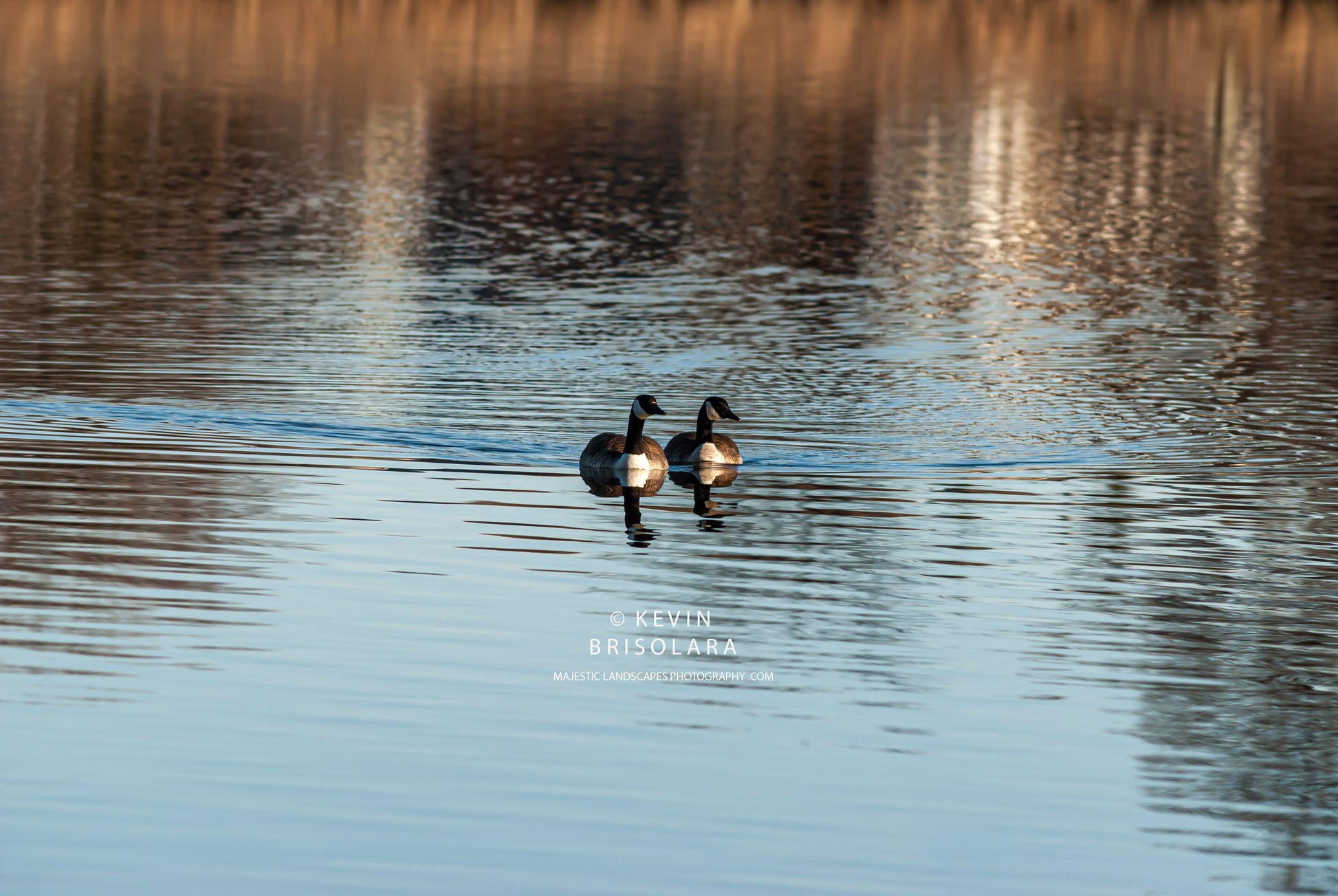 A pair of canada geese swim together in unison keeping close together to strengthen there bond with each other on this spring morning at Wildflower Park. (480-186)